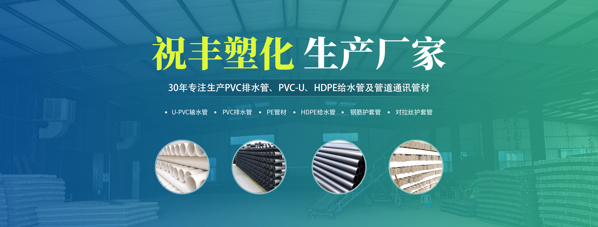 安陽市祝豐塑化有限公司坐落在滑縣工業園區,東臨大廣高速,西臨京珠高速,是鄭州、鶴壁、安陽、濮陽四個城市的輸紐,交通便利、環境優美。       公司始建于八十年代,經過二十余年的艱辛創業,規模不斷壯大,由十多萬元資產的小廠,發展到現占地面積達一萬多平,建筑面積一萬平,資產2000多萬元管材生產企業。公司生產PVC-U、PVC排水管、HDPE給水管、鋼筋護套管管道通訊管材等產品,廣泛用于農田節水、高山引水、人畜用水、建筑、電力通訊等多種用途,品種齊全。為了滿足用戶需求,可承攬各種給水、節水、灌溉工程。“祝豐塑化”憑借強勁的實力,優良的管理水平?!耙再|量求生存,以信譽求發展”的原則全力以赴和大家共同塑造美好未來。..